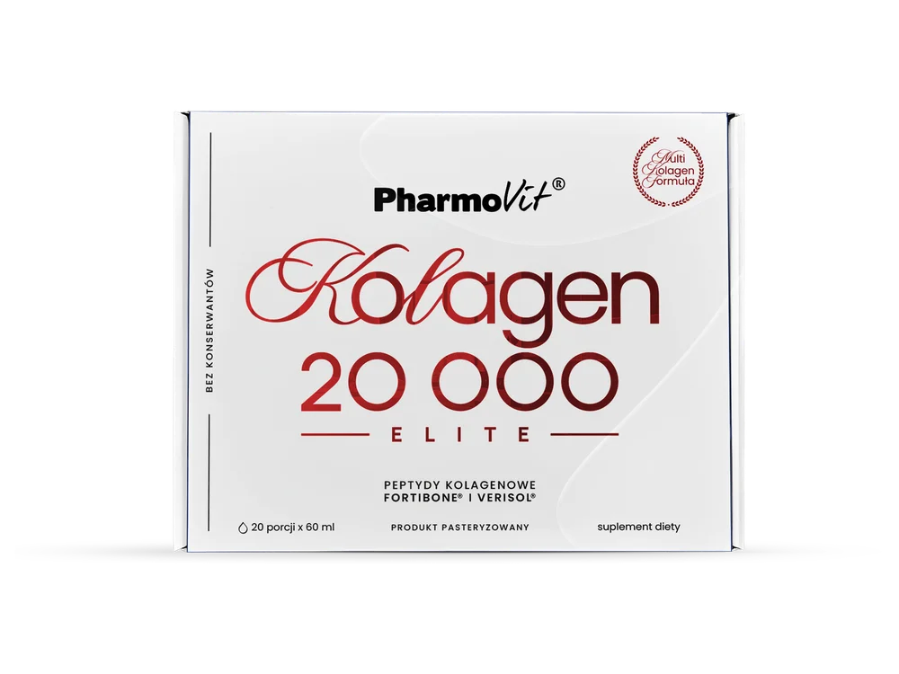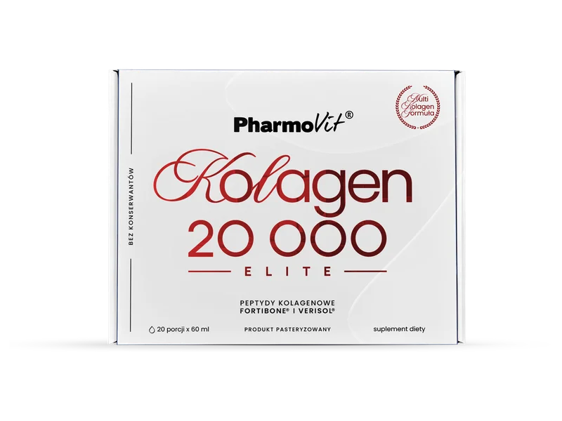 Pharmovit, Kolagen 20000 ELITE to płynny suplement diety, którego formuła opiera się na 20 g hydrolizowanego kolagenu wołowego. Produkt zawiera także kolagen FORTIBONE® i VERISOL® oraz dodatek witaminy C, stanowiącej uzupełnienie składu. Rekomendowany dla dorosłych.