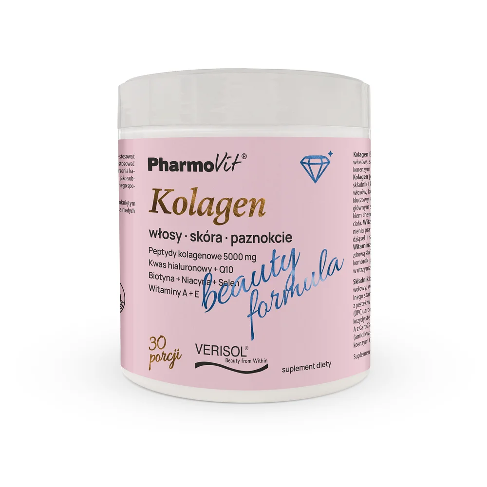 Pharmovit Kolagen Beauty Formula to suplement diety w proszku, którego składniki wspierają prawidłową produkcję kolagenu w organizmie, pomagając w utrzymaniu zdrowej skóry, włosów, paznokci oraz chrząstki i kości. Produkt dla osób dorosłych.