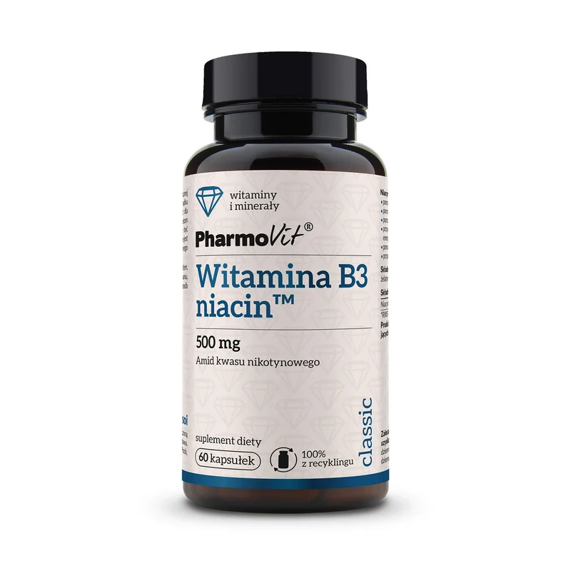 PharmoVit Witamina B3 500 mg to suplement diety, którego składniki wspierają prawidłowe funkcjonowanie organizmu. Witamina B3, znana również jako niacyna, odgrywa istotną rolę w metabolizmie energetycznym i bierze udział w utrzymaniu zdrowej struktury skóry. Dodatkowo, przyczynia się do prawidłowej pracy układu nerwowego. Suplement ten może być stosowany jako element zrównoważonej diety.Składniki