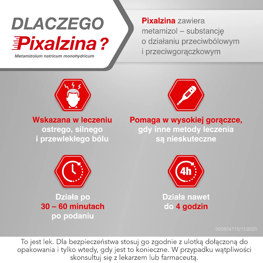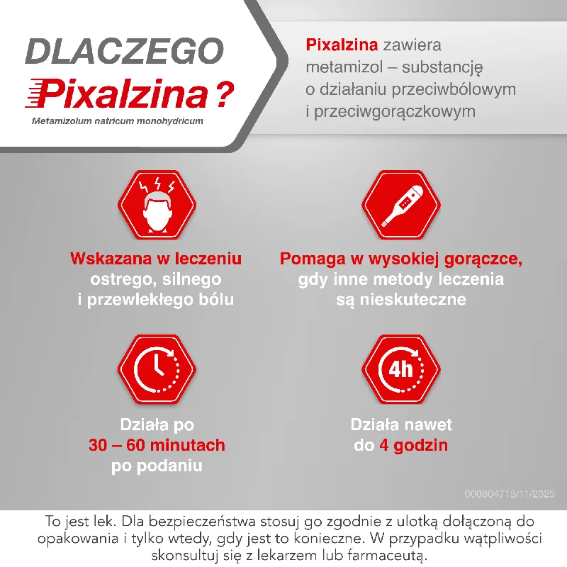 Wskazaniem do stosowania leku Pixalzina jest leczenie ostrego, silnego lub przewlekłego bólu oraz wysokiej gorączki.