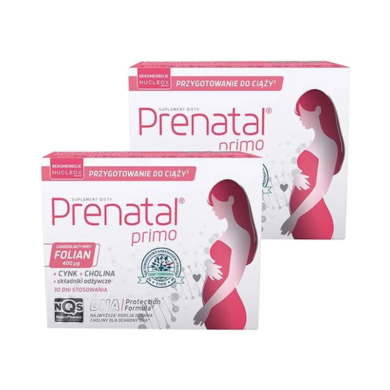 Prenatal Primo to suplement diety dla kobiet dorosłych planujących ciążę. Główne składniki zawarte w produkcie: cholina, witamina D, witamina B6, foliany. Produkt dzięki odpowiednio dobranym składnikom w rekomendowanych porcjach może wspomóc kobietę w okresie planowania ciąży oraz w czasie ciąży.