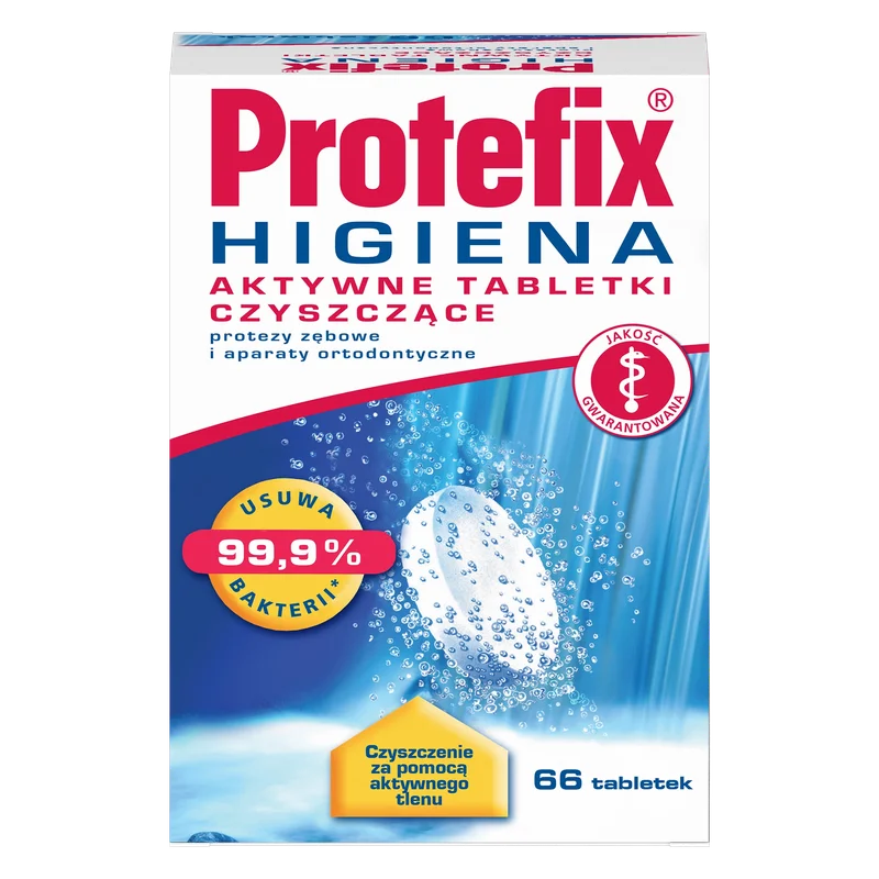 Protefix Higiena, tabletki, 66 szt. – wyrób medyczny, którego składniki wspomagają utrzymanie protez zębowych i aparatów ortodontycznych w czystości.