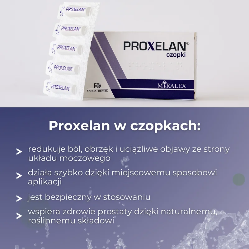Wyjąć czopek Proxelan pociągając za dwa końce nadciętego blistra. Włożyć czopek do odbytu. Należy umyć ręce przed i po użyciu wyrobu medycznego Proxelan. Stosować jeden czopek dziennie, najlepiej wieczorem tuż przed snem, zgodnie z zaleceniami.Zawartość opakowania