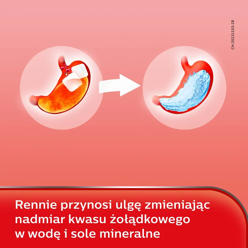 Rennie Antacidum stosuje się do objawowego leczenia dolegliwości związanych z nadkwaśnością soku żołądkowego, takich jak: zgaga, niestrawność, wzdęcia, nudności, uczucie pełności lub ciężkości w nadbrzuszu, odbijanie.