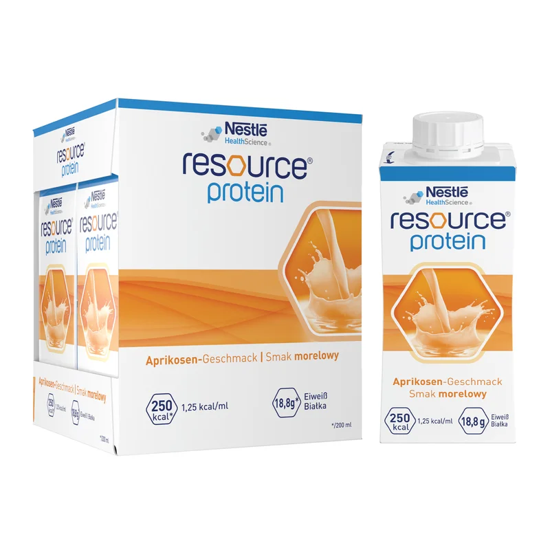 Resource Protein to żywność specjalnego przeznaczenia medycznego w płynie o smaku morelowym. To kompletna pod względem odżywczym, wysokobiałkowa dieta w płynie.