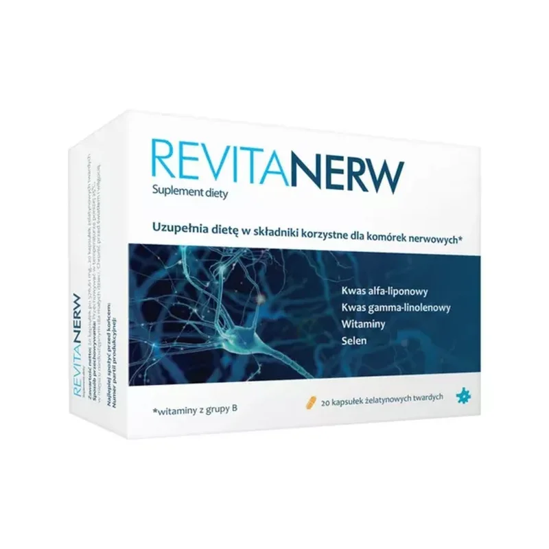 Revitanerw to suplement diety w postaci wygodnych kapsułek żelatynowych twardych, zawierający kompleks witamin z grupy B (B1, B2, B3, B5, B6, B12), selen, kwas alfa-liponowy oraz kwas gamma-linolenowy (GLA). Preparat został stworzony z myślą o osobach dorosłych, które chcą wspierać prawidłowe funkcjonowanie układu nerwowego oraz zachować dobre samopoczucie psychiczne i fizyczne.