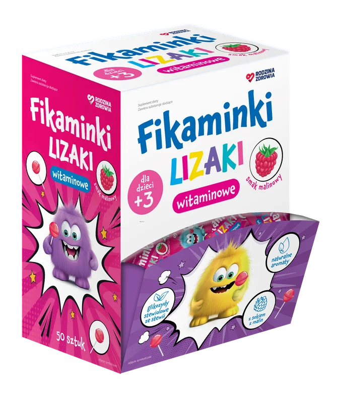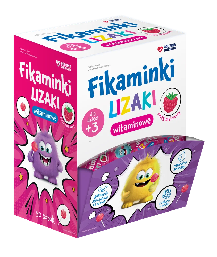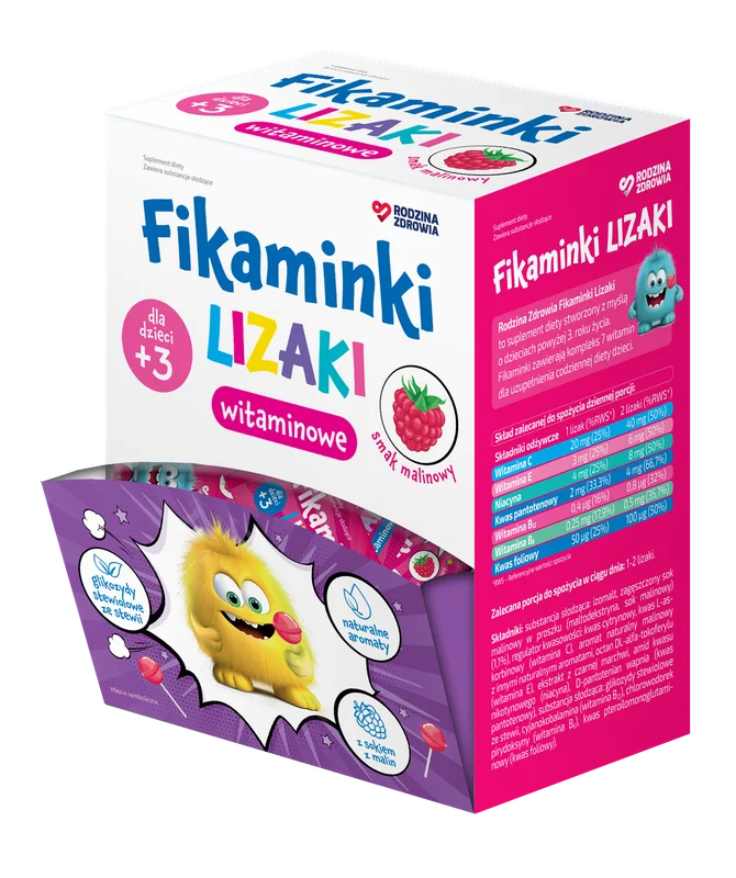 Rodzina Zdrowia, Fikaminki Lizaki to suplement diety, którego składniki wspierają prawidłowy rozwój organizmu oraz dostarczają niezbędne substancje odżywcze. Produkt jest dostępny w formie lizaków, co ułatwia jego spożycie. Lizaki są źródłem składników, które mogą przyczynić się do codziennej diety. Produkt odpowiedni dla dzieci powyżej 3. roku życia oraz dorosłych.