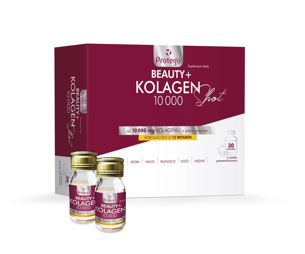 Salvum Lab, Protego Beauty + kolagen 10 000 Shot to suplement diety, który zawiera składniki wspierające kondycję skóry, włosów i paznokci. Produkt odpowiedni dla osób dorosłych.