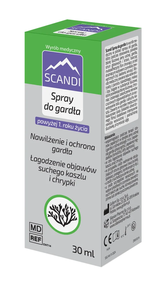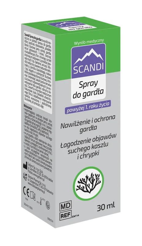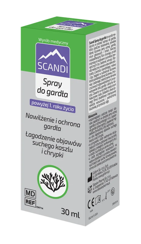 Scandi, spray to wyrób medyczny. Przeznaczony jest do stosowania w celu pielęgnacji i wspomagania funkcji dróg oddechowych. Produkt zawiera składniki, które są pomocne w nawilżaniu błon śluzowych. Sposób aplikacji oraz dawkowanie określane są na podstawie instrukcji zawartej w ulotce. Należy stosować zgodnie z zaleceniami zawartymi w dokumentacji. Produkt przeznaczony jest dla osób dorosłych oraz dzieci powyżej 1. roku życia, zgodnie z warunkami użycia.