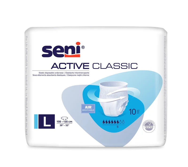 Seni Active Classic L to wyrób medyczny w formie elastycznych majtek chłonnych, przeznaczony dla osób z nietrzymaniem moczu. Produkt charakteryzuje się wysoką chłonnością oraz wygodnym dopasowaniem do ciała. Majtki wykonane są z oddychających materiałów, co zapewnia komfort noszenia. Posiadają anatomiczny kształt, co wpływa na ich dyskrecję. Dedykowane są osobom aktywnym, które potrzebują wsparcia w codziennym funkcjonowaniu.Przeznaczenie produktu