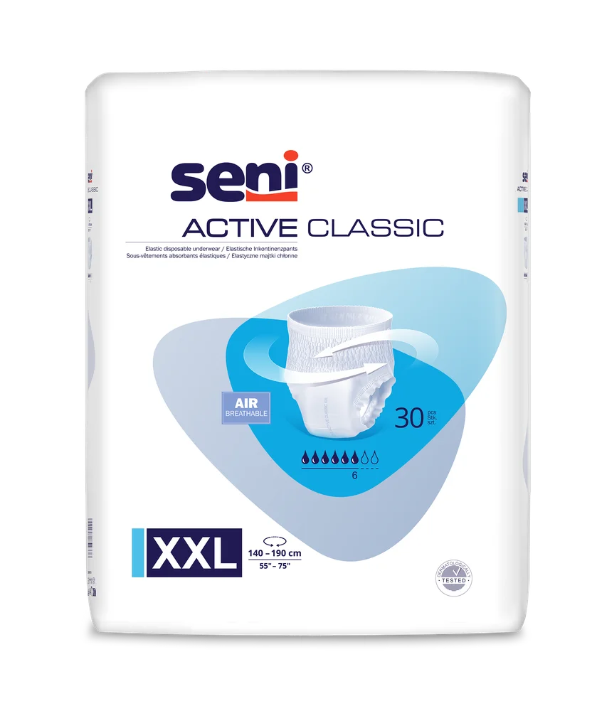 Seni Active Classic XXL to wyrób medyczny dla osób, które mimo problemów z nietrzymaniem moczu chcą zachować komfort, swobodę ruchu i poczucie bezpieczeństwa. Sprawdzają się zarówno w codziennych aktywnościach, jak i podczas zajęć rehabilitacyjnych.