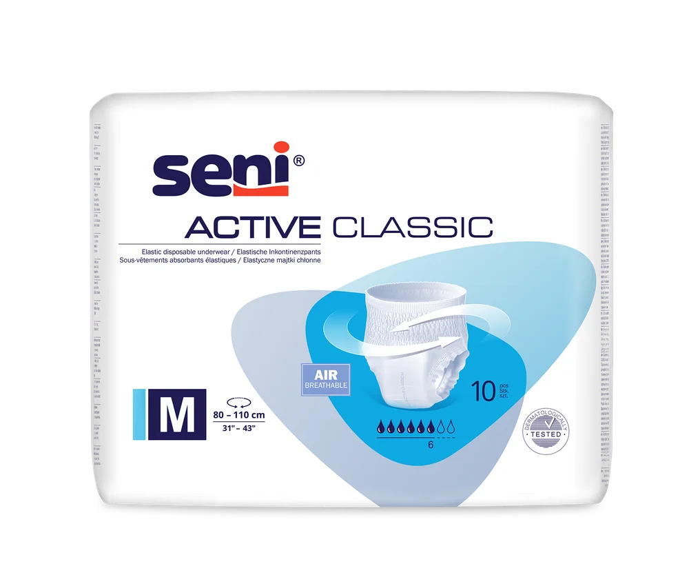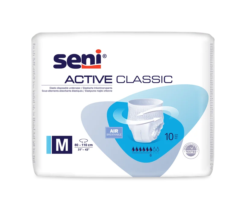 Seni Active Classic M to wyrób medyczny, który przeznaczony jest do stosowania przez osoby z nietrzymaniem moczu. Elastyczne majtki chłonne zapewniają komfort i bezpieczeństwo, umożliwiając swobodę ruchów. Produkty te charakteryzują się wysoką chłonnością oraz skuteczną barierą przeciwwilgociową. Umożliwiają łatwe zakładanie oraz zdejmowanie, co zwiększa wygodę użytkowania. Seni Active Classic M jest odpowiedni do noszenia w różnych sytuacjach życiowych, zapewniając dyskrecję i pewność.Przeznaczenie produktu