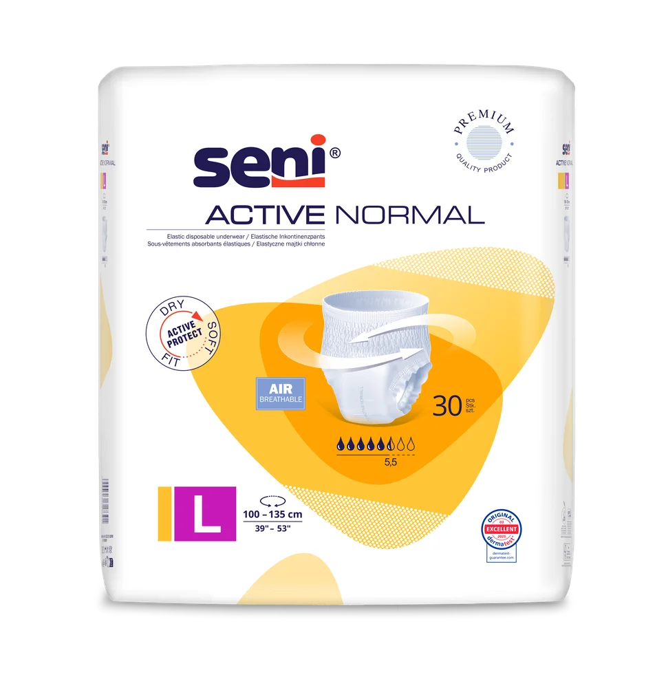 Seni Active Normal, majtki chłonne, rozmiar L to wyrób medyczny jednorazowego użytku w postaci elastycznych majtek o wysokiej chłonności (5,5/7). Produkt odpowiedni dla osób dorosłych.
