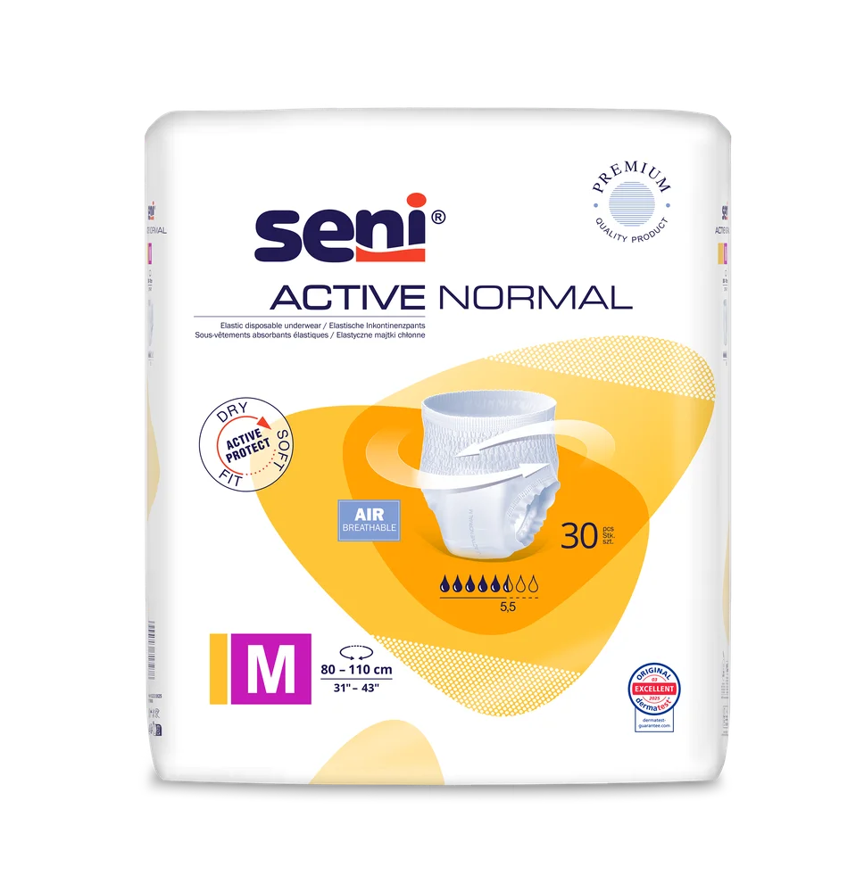 Elastyczne majtki chłonne Seni Active Normal jednorazowego użytku to idealne rozwiązanie dla osób z lekkim i średnim stopniem nietrzymania moczu, prowadzących aktywny tryb życia oraz dla uczestników zajęć rehabilitacji ruchowej.