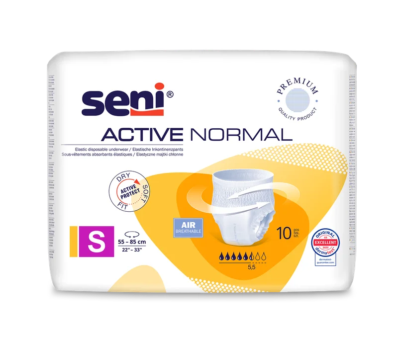 Seni Active Normal Small to wyrób medyczny, który przeznaczony jest dla osób z nietrzymaniem moczu. Produkt charakteryzuje się anatomicznym kształtem oraz elastycznymi bocznymi skrzydłami, co zapewnia komfort noszenia. Majtki chłonne wykonane są z oddychających materiałów, które pozwalają na swobodny przepływ powietrza. Posiadają chłonny wkład, który skutecznie absorbuje wilgoć. Seni Active Normal Small oferują odpowiednią ochronę i dyskrecję w codziennym użytkowaniu.Przeznaczenie produktu