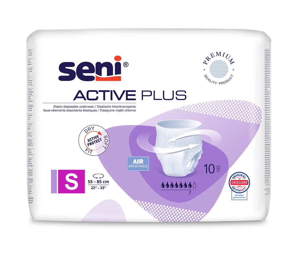 Elastyczne majtki chłonne Seni Active Plus jednorazowego użytku to idealne rozwiązanie dla osób ze średnim i ciężkim stopniem nietrzymania moczu, prowadzących aktywny tryb życia oraz dla uczestników zajęć rehabilitacji ruchowej.