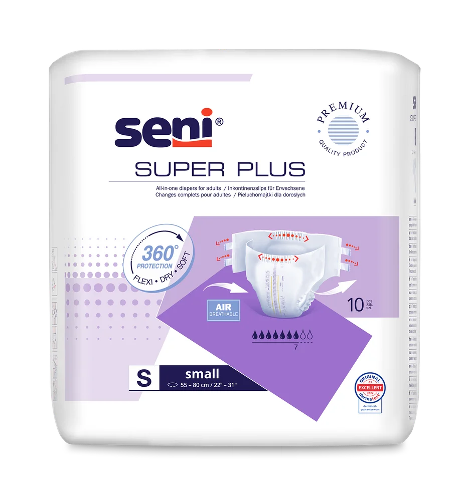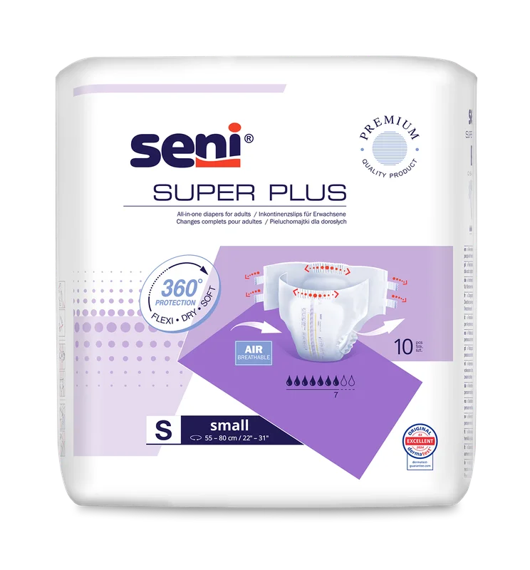 Seni Super Plus Small to wyrób medyczny, przeznaczony dla osób z nietrzymaniem moczu. Pieluchomajtki charakteryzują się wysoką chłonnością oraz skuteczną ochroną przed przeciekami. Zapewniają komfort noszenia dzięki elastycznym bocznym panelom oraz anatomicznemu kształtowi. Produkt posiada system odprowadzania wilgoci, co wspomaga utrzymanie skóry w suchości. Pieluchomajtki są przeznaczone do stosowania w różnych sytuacjach, wspierając codzienną aktywność użytkowników.