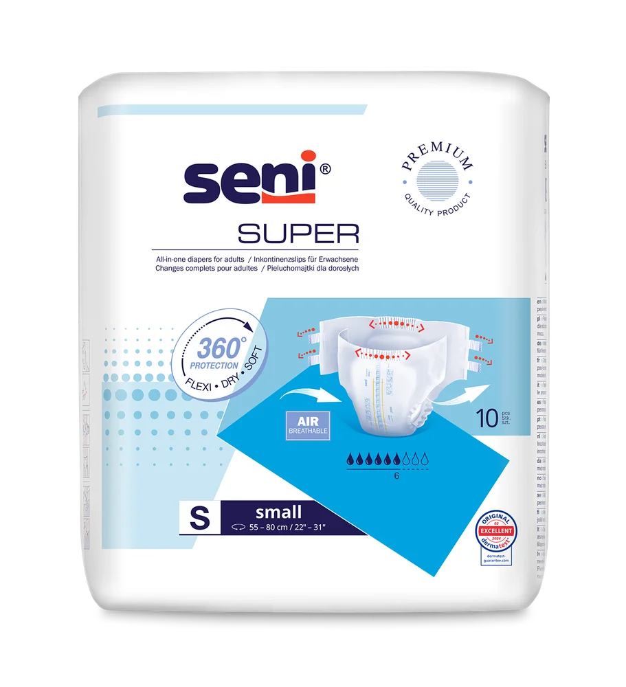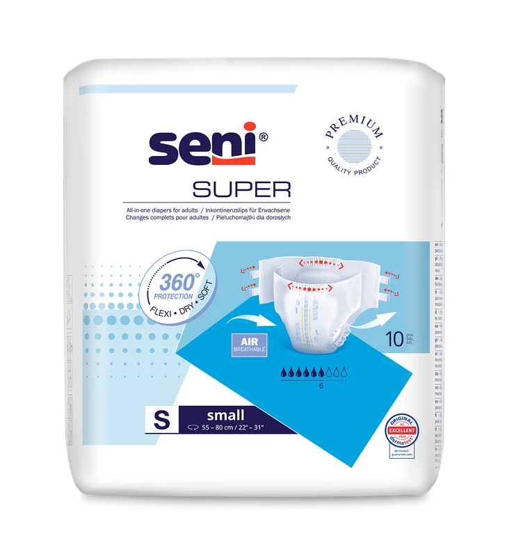 Seni Super Seni Small A10 Pieluchomajtki to wyrób medyczny przeznaczony dla osób z nietrzymaniem moczu. Produkt charakteryzuje się wysoką chłonnością oraz elastycznymi bocznymi skrzydłami, co zapewnia komfort i dopasowanie do ciała. Pieluchomajtki wyposażone są w system wentylacji, który wspiera utrzymanie odpowiedniej cyrkulacji powietrza. Dzięki zastosowanej technologii, pieluchomajtki minimalizują ryzyko podrażnień skóry. Są łatwe w zakładaniu i zdejmowaniu.Przeznaczenie produktu