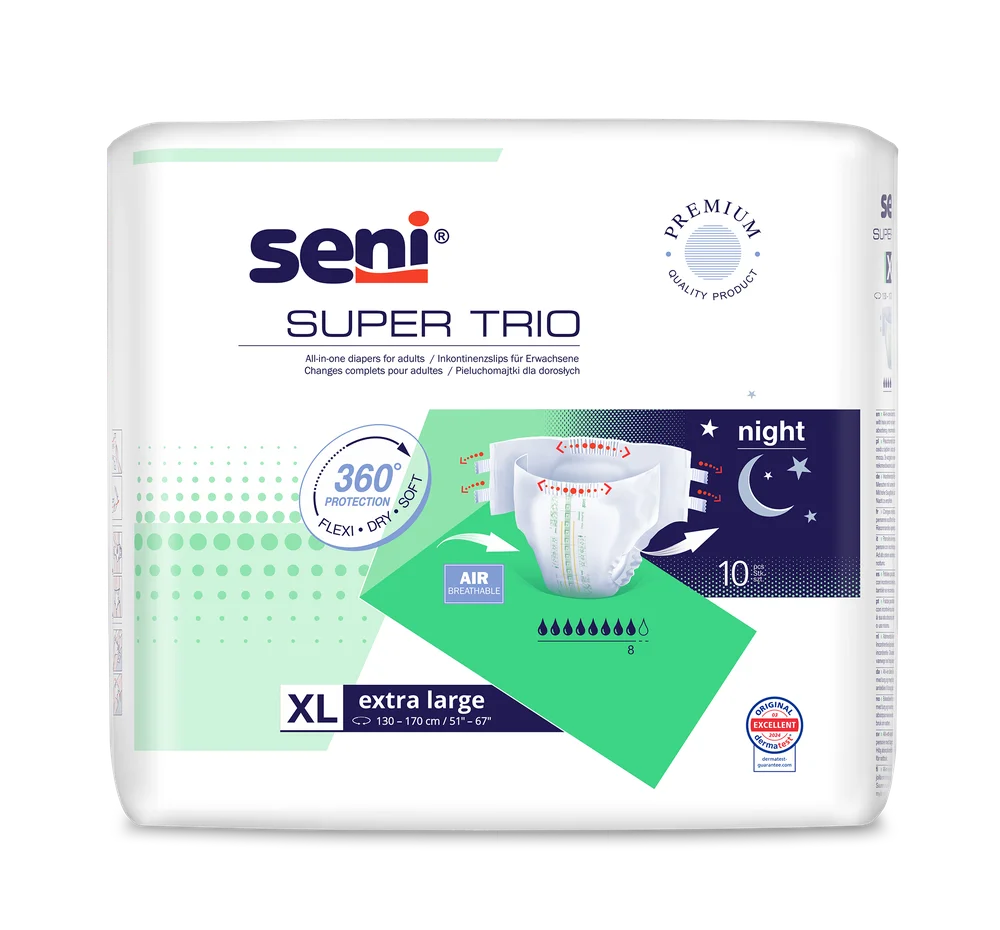Seni Super Trio, pieluchomajtki dla dorosłych – to wyrób medyczny przeznaczony dla osób zmagających się z nietrzymaniem moczu w stopniu ciężkim i bardzo ciężkim.