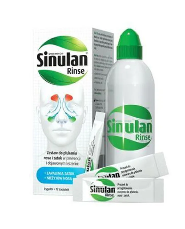 Sinulan Rinse Zestaw do płukania nosa i zatok to wyrób medyczny przeznaczony do płukania nosa i zatok wskazany do objawowego leczenia, w przypadku: zapalenia błony śluzowej nosa i zatok, kataru o różnym podłożu. Może być wykorzystywany także w higienie nosa i zatok.Stosowanie produktu