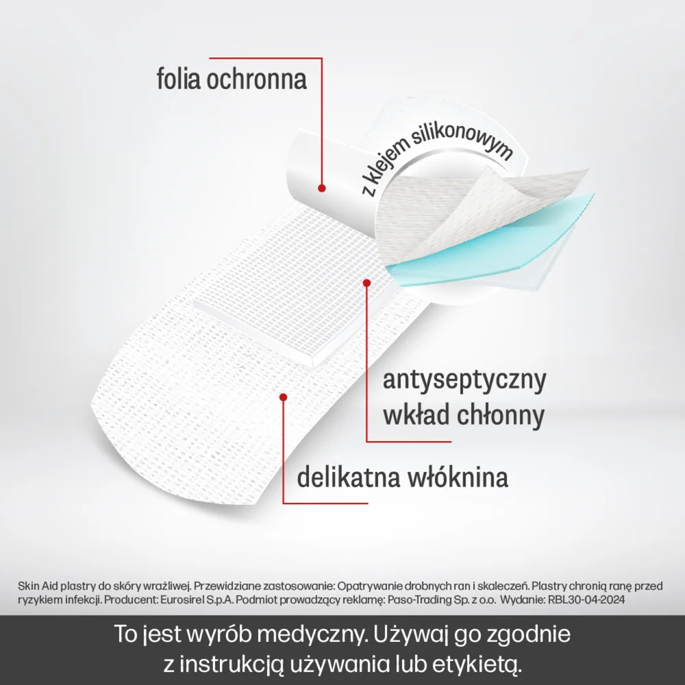 Skin Aid to wyrób medyczny, przeznaczony do ochrony skóry wrażliwej. Plastry są stosowane w celu wspomożenia procesów gojenia drobnych ran, otarć oraz podrażnień. Charakteryzują się delikatną strukturą, co sprzyja ich zastosowaniu na skórze wrażliwej. Produkt jest przygotowany w formie przylepca, co umożliwia łatwe i wygodne aplikowanie. Przeznaczony jest do stosowania na skórę w celu zapewnienia ochrony przed czynnikami zewnętrznymi. Produkt odpowiedni dla osób dorosłych.