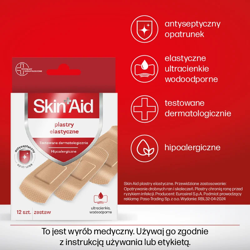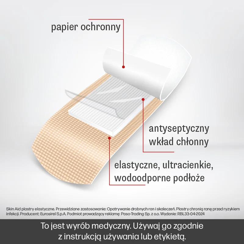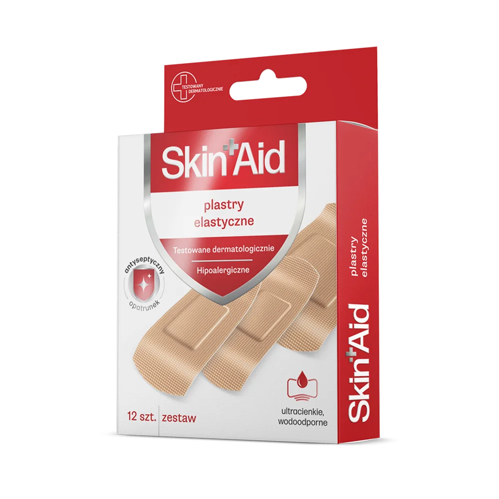 Skin Aid, plastry elastyczne to wyrób medyczny opracowany do zabezpieczania i ochrony ran i otarć. Posiada właściwości oddychające, co pozwala na komfortowe użytkowanie. Plastry są samoprzylepne i dostosowują się do kształtu ciała, co ułatwia ich aplikację w różnych miejscach. Produkt jest przeznaczony do stosowania na skórę, zapewniając wsparcie w procesie gojenia.
