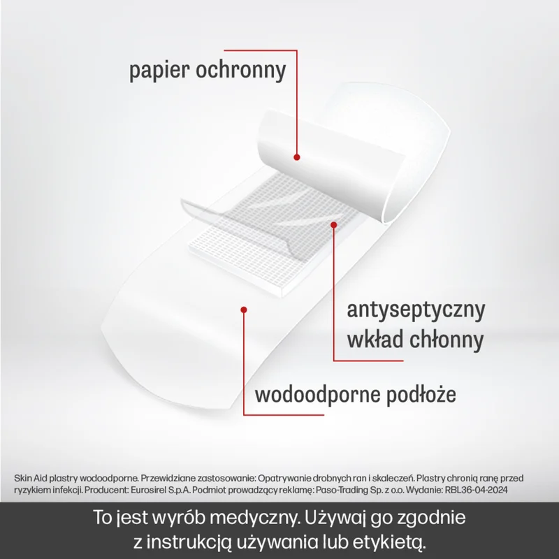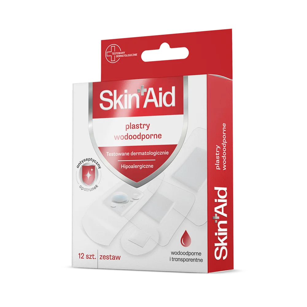 Skin Aid, zestaw plastrów wodoodporny, 12 sztuk, to wyrób medyczny przeznaczony do ochrony ran i otarć. Produkt ma właściwości antyseptyczne, które wspierają gojenie i zabezpieczają przed działaniem czynników zewnętrznych. Zestaw zawiera 12 sztuk plastrów. Produkt testowany dermatologicznie, hipoalergiczny.