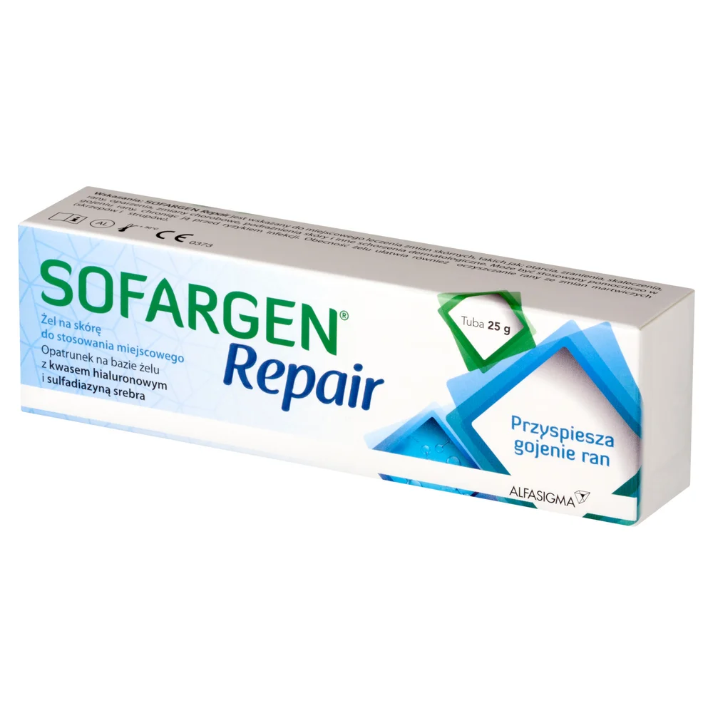 Sofargen Repair to wyrób medyczny w formie żelu, przeznaczony do stosowania na skórę. Produkt zawiera substancje wspomagające regenerację i odbudowę tkanek. Wskazany jest do stosowania w przypadku uszkodzeń skóry, ran, oparzeń oraz innych zmian skórnych. Należy stosować zgodnie z zaleceniami zawartymi w ulotce. Przed użyciem należy zapoznać się z informacjami zawartymi w dokumentacji.Składniki