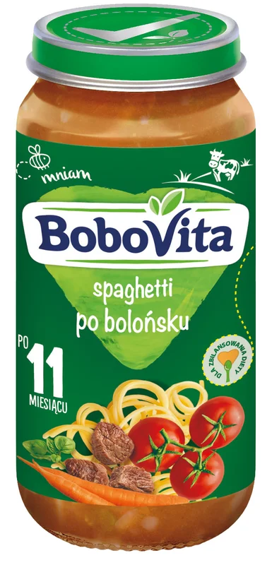 BoboVita Spaghetti po bolońsku po 11. miesiącu to gotowy do podania obiadek przeznaczony dla dzieci po 11. miesiącu życia. Odpowiednio skomponowany skład oraz struktura dania z wyczuwalnymi kawałkami wspierają rozwój umiejętności gryzienia i żucia. Pełnowartościowa receptura opiera się na starannie wyselekcjonowanych składnikach, tworzących kompozycję warzyw będących źródłem błonnika. Produkt został przygotowany z dbałością o jakość potwierdzoną w 100%, aby odpowiadać na szczególne potrzeby żywieniowe najmłodszych dzieci.