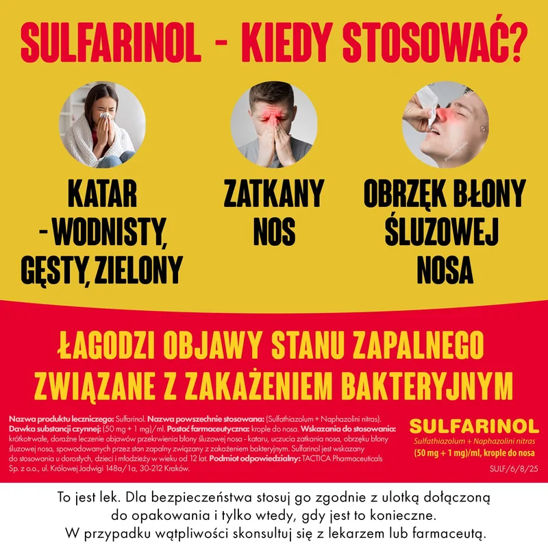 Sulfarinol to produkt leczniczy wskazany w leczeniu kataru, uczucia zatkania nosa i obrzęku błony śluzowej nosa, spowodowanych przez stan zapalny związany z zakażeniem bakteryjnym.