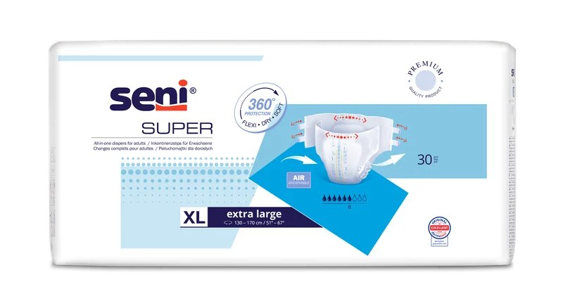 Seni Super, pieluchomajtki dla dorosłych zapinane na rzepy to wyrób medyczny przeznaczony dla osób zmagających się z nietrzymaniem moczu w stopniu średnim i ciężkim.