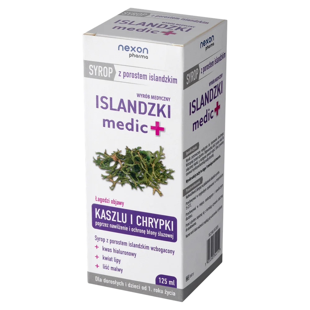 Syrop Islandzki Medic+ to wyrób medyczny w płynnej formie, przeznaczony dla dzieci od 1. roku życia oraz osób dorosłych, zawierający kompozycję naturalnych ekstraktów roślinnych. W składzie znajdują się m.in. jabłko, aronia, lipa oraz malwa, które odpowiadają za właściwości osłaniające i pielęgnujące błony śluzowe gardła i krtani. Produkt nie zawiera alkoholu, dodatku cukru ani sztucznych barwników, dzięki czemu może być stosowany w różnych grupach wiekowych.