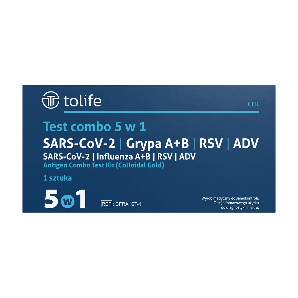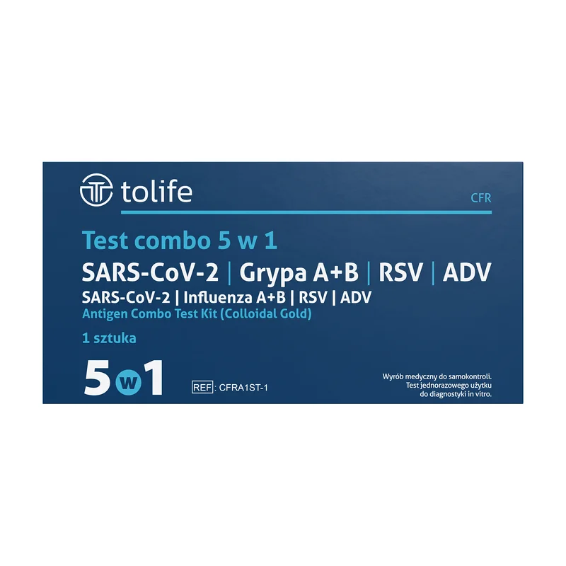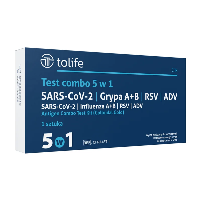Test 5w1, combo test: SARS-CoV-2 & grypa A+B & RSV & ADV to wyrób medyczny, który umożliwia jednoczesne wykrywanie pięciu patogenów wirusowych: SARS-CoV-2, wirusa grypy A, wirusa grypy B, wirusa RSV oraz wirusa adenowirusa (ADV). Produkt jest przeznaczony do diagnostyki zakażeń wywołanych przez wymienione wirusy. Może być stosowany w warunkach klinicznych do potwierdzenia obecności tych wirusów w próbkach pacjentów. Wymaga przestrzegania instrukcji użycia zawartej w ulotce.Składniki