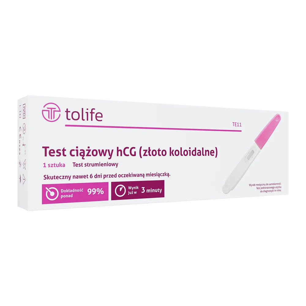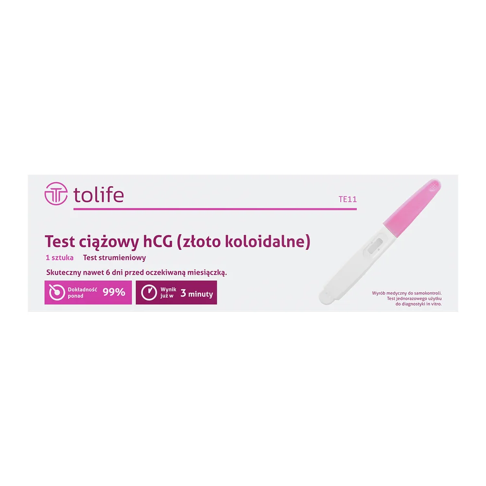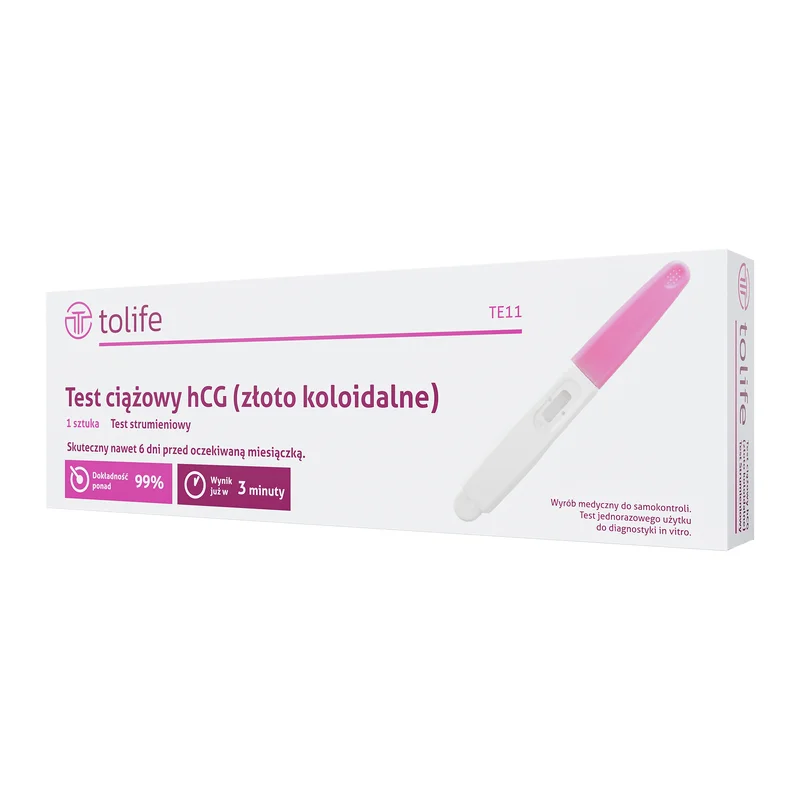 Test ciążowy strumieniowy, 1 sztuka, to jednorazowy test diagnostyczny do wykrywania ciąży, który służy do szybkiego oznaczenia obecności hormonu hCG (gonadotropiny kosmówkowej) w moczu.