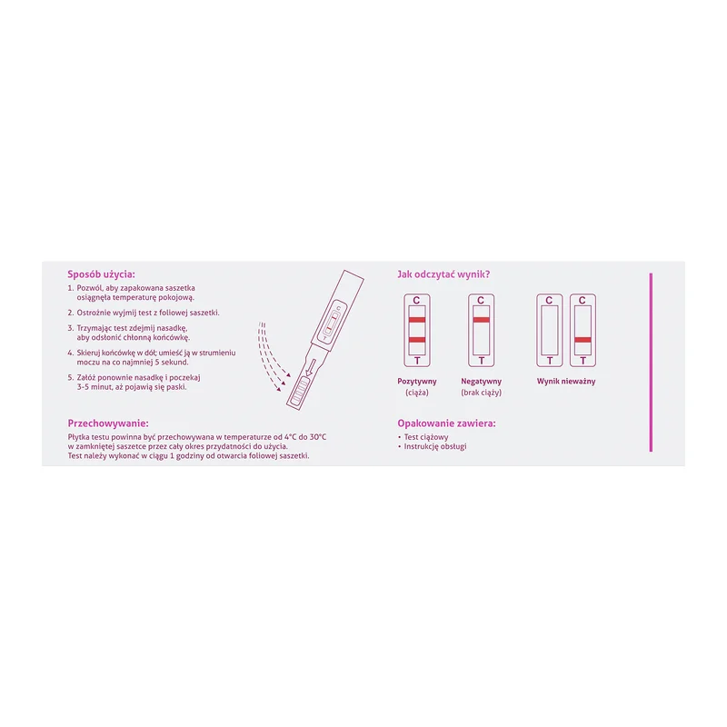 Test ciążowy strumieniowy, 1 sztuka to wyrób medyczny. Służy do wykrywania hormonu hCG w moczu, co pozwala na potwierdzenie ciąży. Test należy przeprowadzić zgodnie z instrukcją, a wyniki odczytać po upływie określonego czasu. Test charakteryzuje się łatwością w użyciu oraz szybkim czasem reakcji. W celu uzyskania najdokładniejszych rezultatów zaleca się jego stosowanie w odpowiednich warunkach. Produkt jest jednorazowego użytku.Składniki