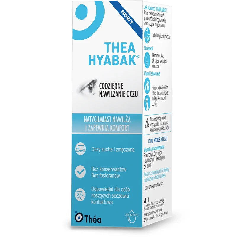 TheaHyabak to wyrób medyczny przeznaczony do nawilżania oraz łagodzenia podrażnień oczu. Produkt zawiera składniki, które wspierają regenerację powierzchni oka oraz działają w przypadku uczucia suchości. Może być stosowany w przypadku noszenia soczewek kontaktowych oraz w warunkach sprzyjających podrażnieniom oczu. Zawiera substancje o działaniu nawilżającym, co przyczynia się do poprawy komfortu widzenia. Przed użyciem zaleca się zapoznanie z ulotką.Składniki
