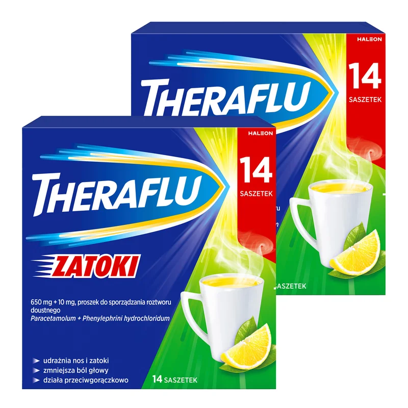 Theraflu Zatoki 650 mg + 10 mg to produkt leczniczy, który łączy działanie dwóch substancji czynnych: paracetamolu i fenylefryny. Produkt dla osób dorosłych i dzieci powyżej 12. roku życia.