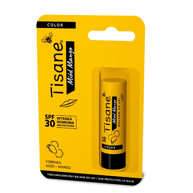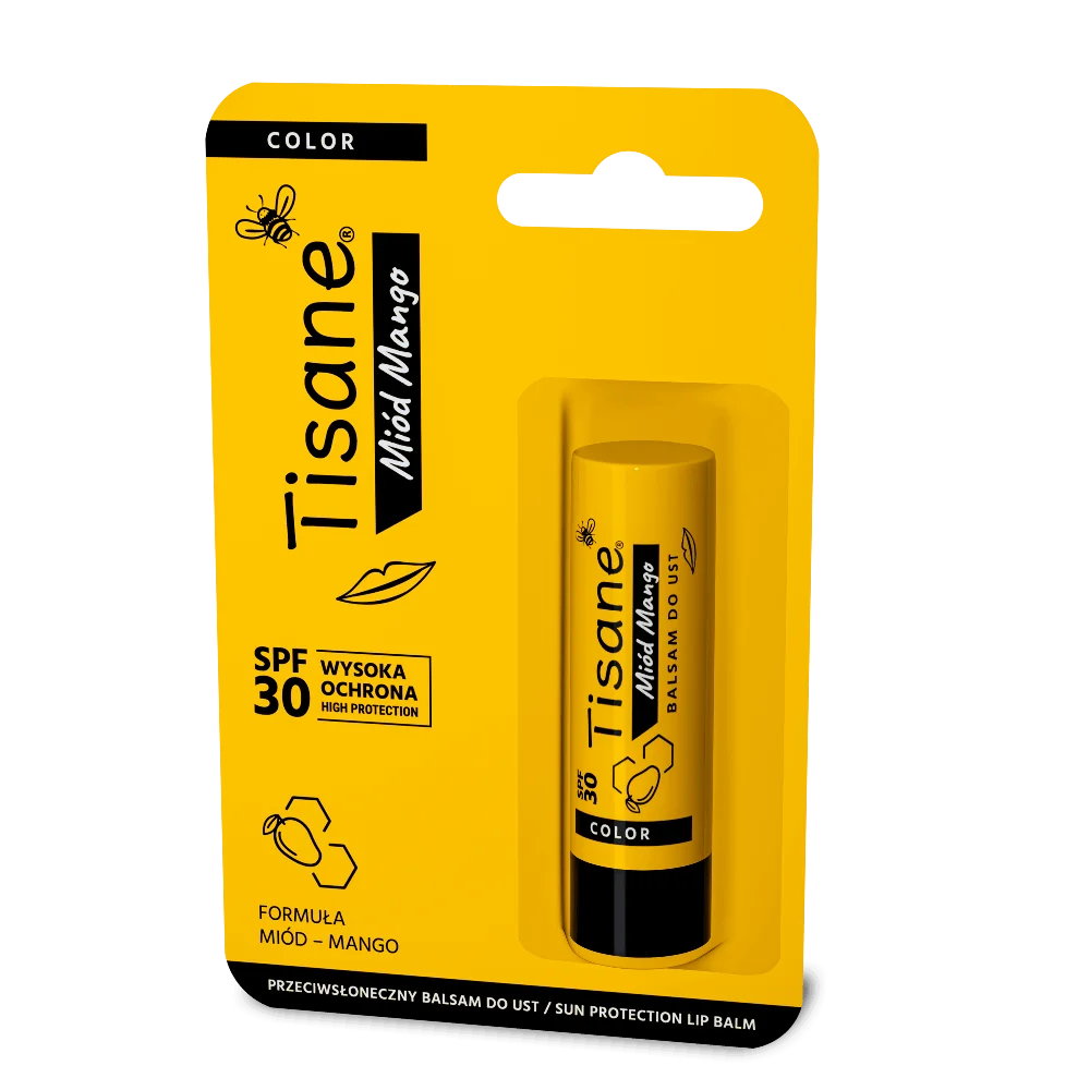 Tisane Color Miód Mango SPF 30 to produkt kosmetyczny. Balsam do ust zapewnia kompleksową pielęgnację i ochronę przeciwsłoneczną. Dzięki połączeniu składników nawilżających i odżywczych wspiera komfort i regenerację skóry ust, a owocowy aromat mango zwiększa przyjemność stosowania. Zawarty filtr SPF 30 chroni usta przed negatywnym wpływem promieniowania UV oraz czynników atmosferycznych.