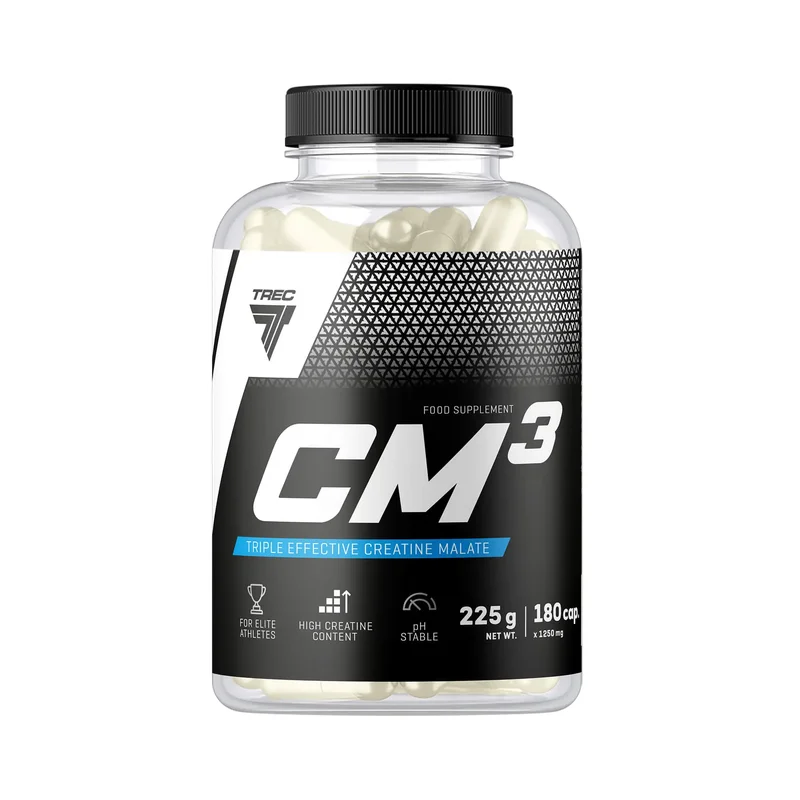 TREC CM3 to suplement diety kreatynowy, którego głównym składnikiem aktywnym jest jabłczan trikreatyny jedna najbardziej stabilnych form kreatyny. Produkt odpowiedni dla osób dorosłych aktywnych fizycznie i sportowców.