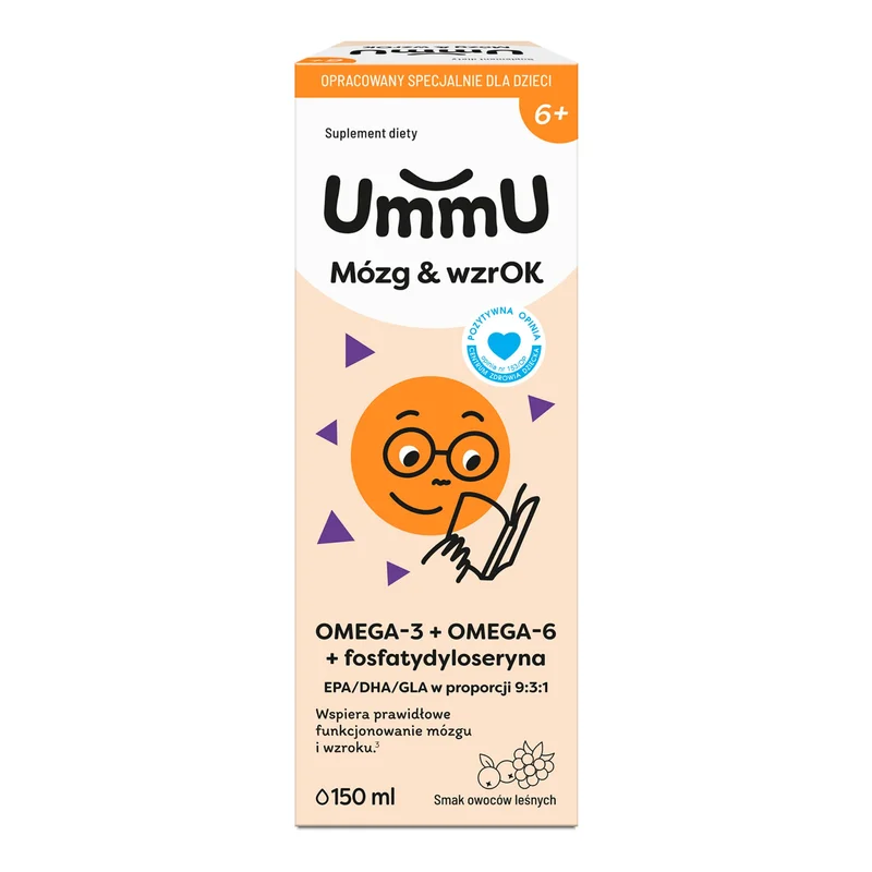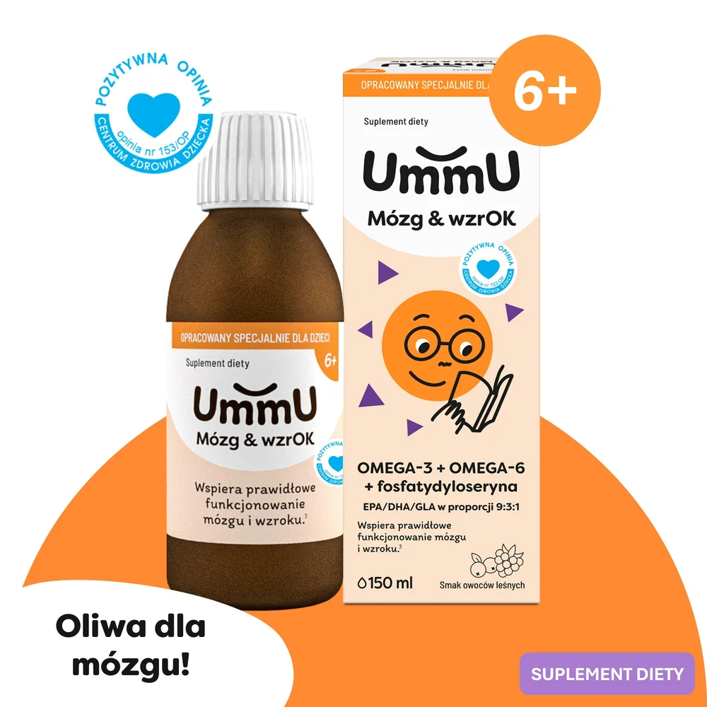 UmmU Mózg&wzrok 6+ to suplement diety w płynie, którego składniki wspierają prawidłowy rozwój funkcji poznawczych i wzroku u dorosłych i dzieci powyżej 6 lat.