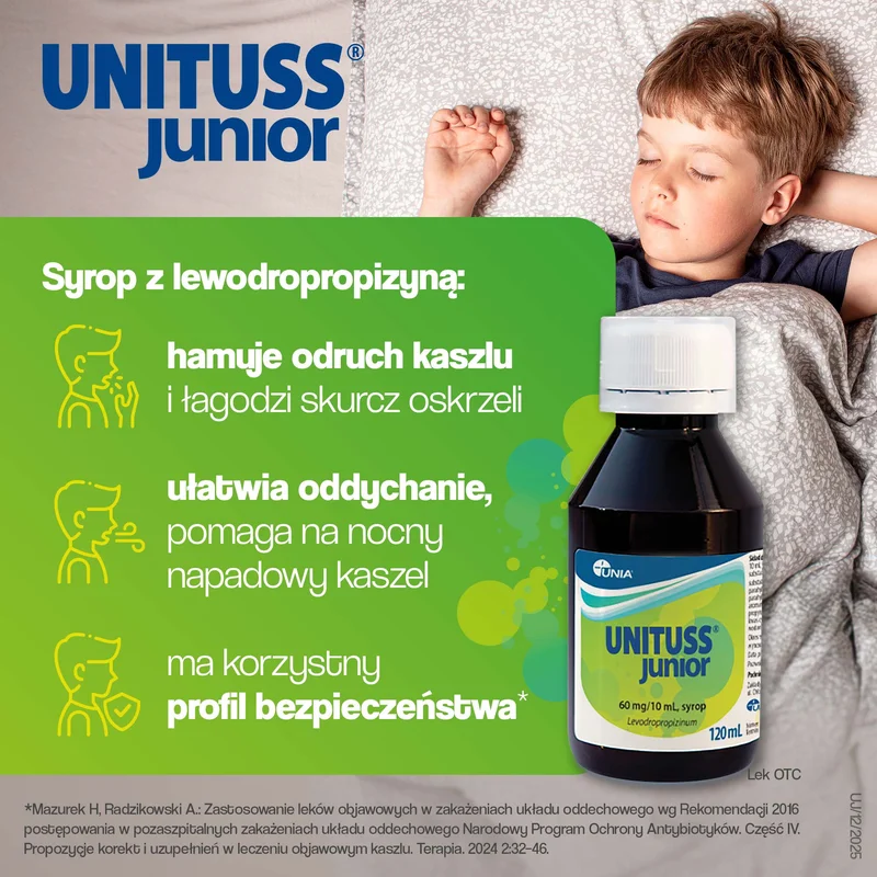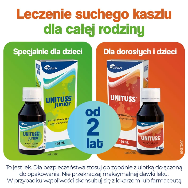 Unituss Junior jest produktem leczniczym stosowanym w objawowym leczeniu nieproduktywnego kaszlu. Lek Unituss Junior zawiera substancję czynną lewodropropizynę o działaniu przeciwkaszlowym i znoszącym skurcz oskrzeli. Produkt leczniczy przeznaczony dla dzieci powyżej 2 roku życia i dorosłych.