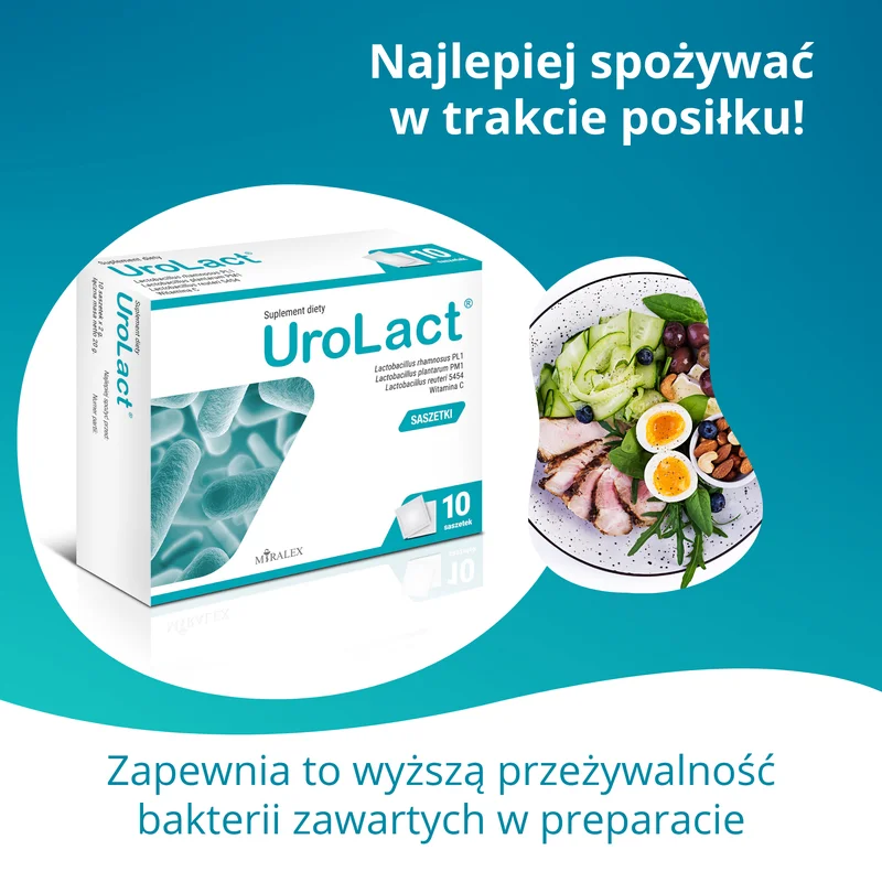 Zawartość saszetki rozpuścić w niewielkiej ilości letniej wody (100 ml), odczekać kilka minut, starannie wymieszać i wypić. Preparat UroLact® najlepiej spożywać w trakcie posiłku (zapewnia to wyższą przeżywalność bakterii zawartych w preparacie). W przypadku ostrych stanów zapalnych stosować 2 saszetki dziennie (rano i wieczorem) przez pierwsze 7 dni. Czas stosowania Brak ograniczeń. Dla przywrócenia właściwej równowagi mikroflory układu moczowo–płciowego i odbytu produkt powinien być stosowany nie krócej niż 14 dni.Ostrzeżenia dotyczące bezpieczeństwa