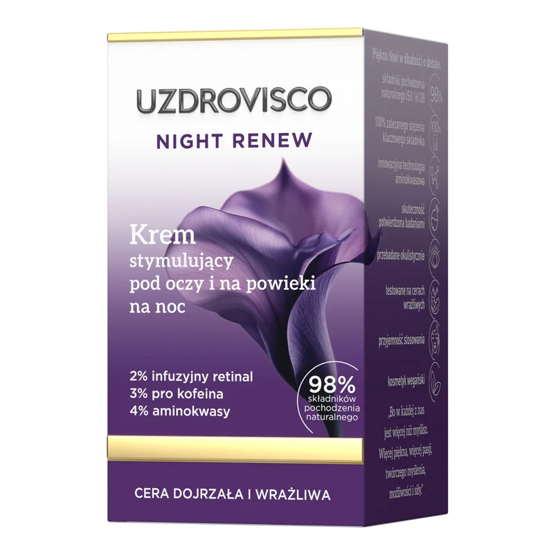Uzdrovisco Night Renew Krem stymulujący pod oczy i na powieki na noc to silnie skoncentrowany kosmetyk, który poprawia napięcie i sprężystość delikatnej skóry wokół oczu, wygładza zmarszczki i przywraca spojrzeniu młodszy, wypoczęty wygląd.