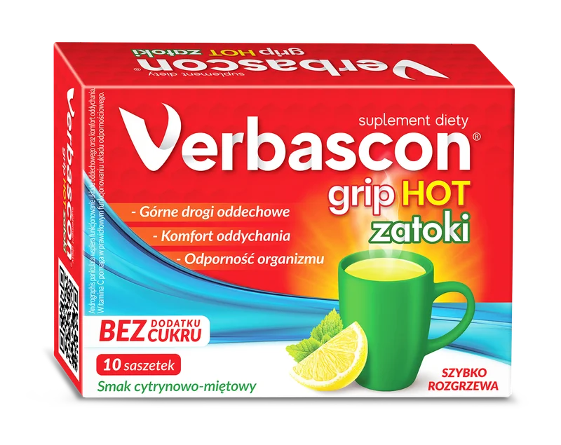 Verbascon Grip Hot Zatoki to suplement diety dla dorosłych w postaci proszku do sporządzenia zawiesiny. Kompozycja preparatu bazuje na starannie dobranych składnikach roślinnych: bez czarny (kwiat), werbena pospolita, jeżówka purpurowa oraz mięta pieprzowa. Całość wzbogacono o witaminę C i cynk, cenione składniki wspierające prawidłowe funkcjonowanie organizmu. Zawiesina ma cytrynowo-miętowy smak, co podnosi komfort stosowania.