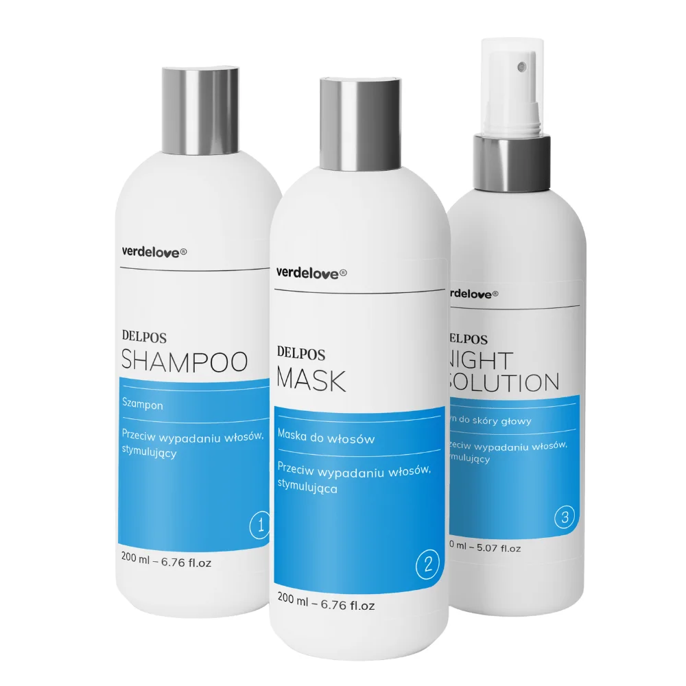 Verdelove Delpos Anti Hair Loss, płyn, szampon, maska – to zestaw produktów kosmetycznych przeznaczonych do pielęgnacji włosów osłabionych i skłonnych do wypadania.