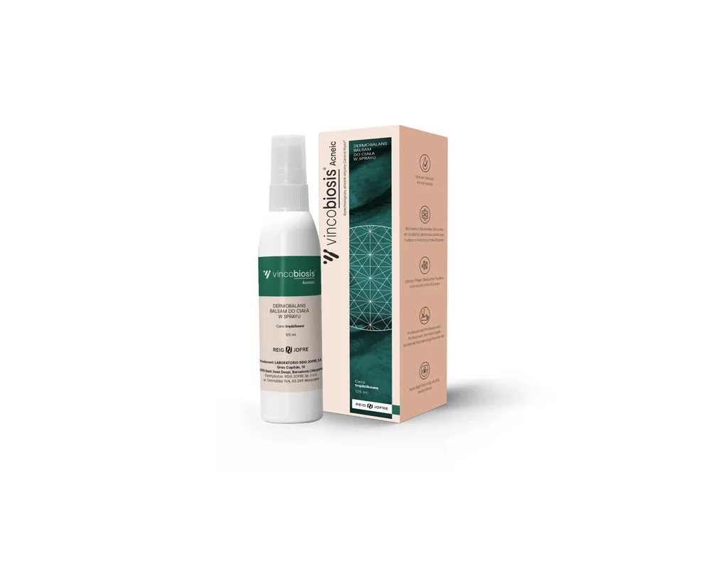 Vincobiosis® Acneic Dermobalans, Balsam do ciała w sprayu to kosmetyk, który pomaga redukować niedoskonałości skóry trądzikowej, wspiera równowagę mikrobioty skóry i zapewnia komfort codziennej pielęgnacji. Produkt testowany klinicznie i dermatologicznie.