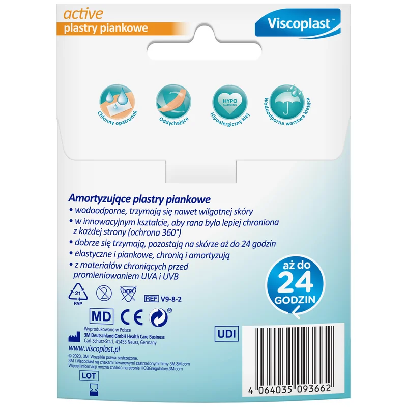 Viscoplast Active plastry piankowe to wyrób medyczny, zestaw plastrów wodoodpornych w dwóch rozmiarach z materiałów chroniących przed promieniowaniem UVA i AVB. Plastry posiadają chłonny opatrunek, są oddychające i posiadają hipoalergiczny klej. Posiadają innowacyjny kształt pozwalający lepiej chronić ranę z każdej strony. Plastry wykonane są z materiałów chroniących przed promieniowaniem UVA i UVB.
