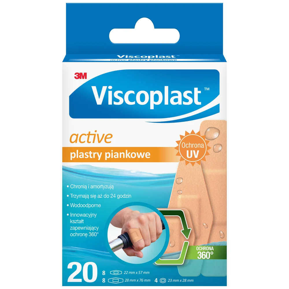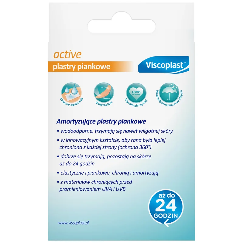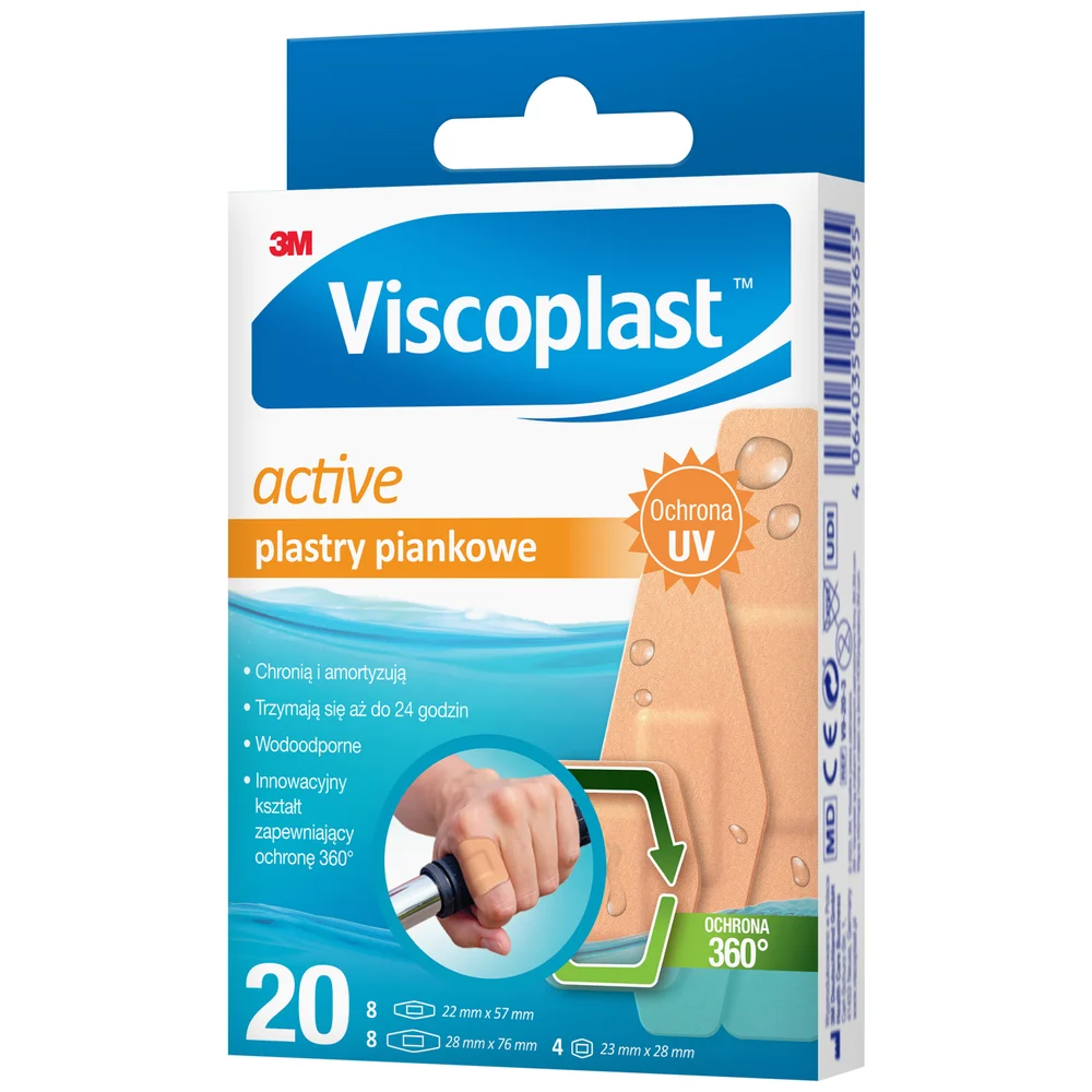 Viscoplast Active plastry piankowe to wyrób medyczny zestaw plastrów wodoodpornych w trzech rozmiarach z materiałów chroniących przed promieniowaniem UVA i AVB. Plastry posiadają chłonny opatrunek, są oddychające i posiadają hipoalergiczny klej. Posiadają innowacyjny kształt pozwalający lepiej chronić ranę z każdej strony. Plastry wykonane są z materiałów chroniących przed promieniowaniem UVA i UVB.