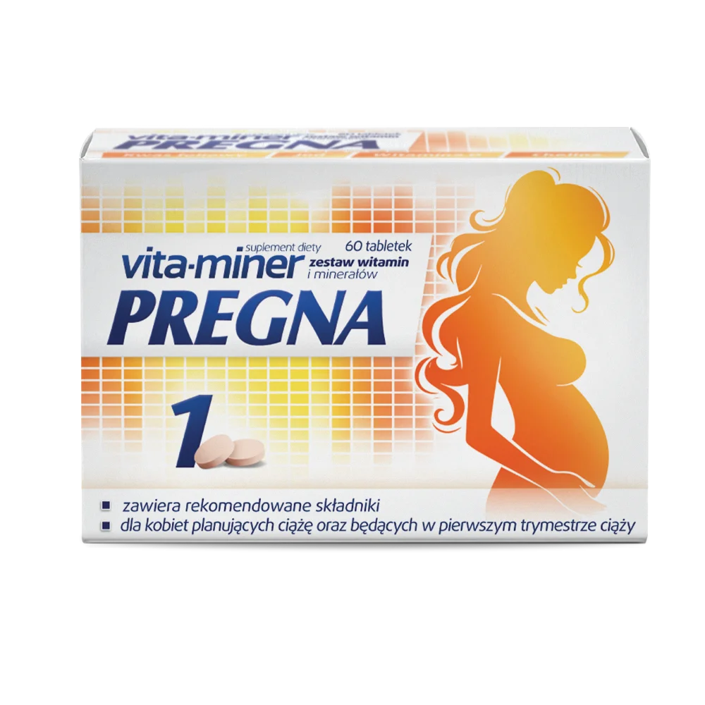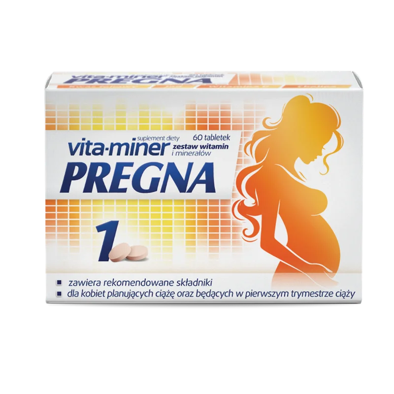 Vita-Miner Pregna to suplement diety, którego składniki wspierają organizm w okresie ciąży, dostarczając niezbędnych witamin i minerałów. Zawiera kompleks składników odżywczych, które pomagają w zaspokajaniu zwiększonych potrzeb żywieniowych przyszłych mam. Składniki suplementu przyczyniają się do utrzymania odpowiednich poziomów składników mineralnych oraz witamin, co jest ważne w tym szczególnym czasie. Produkt przeznaczony dla osób dorosłych.