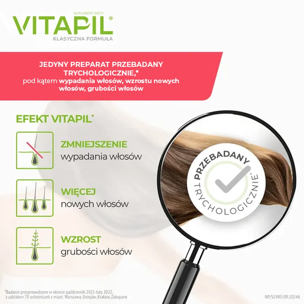 Vitapil to suplement diety w postaci kapsułek, który w swoim składzie zawiera między innymi: biotynę, miedź, cynk, żelazo czy magnan. Składniki wspierają kondycję włosów, skóry i paznokci. Preparat przeznaczony dla osób dorosłych.